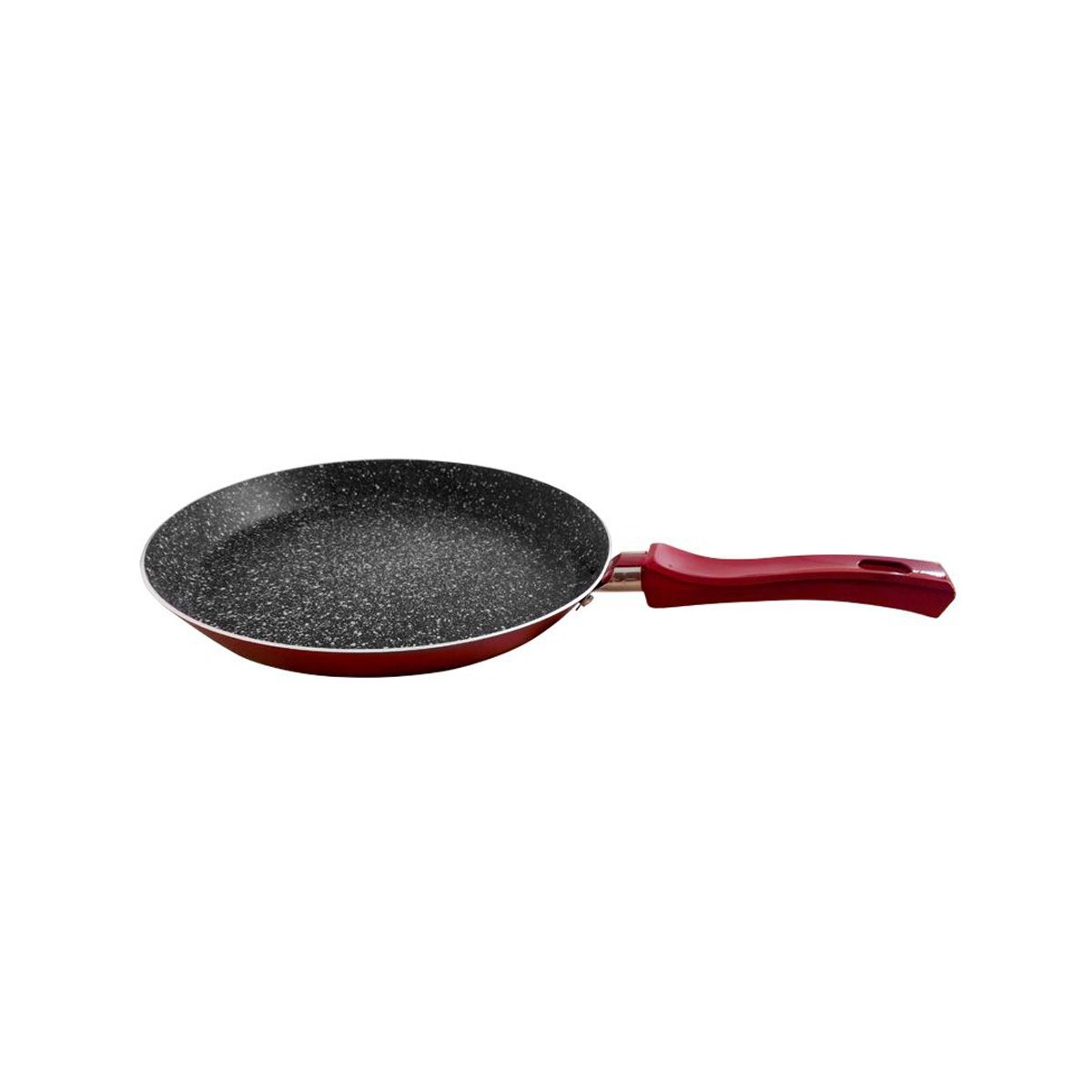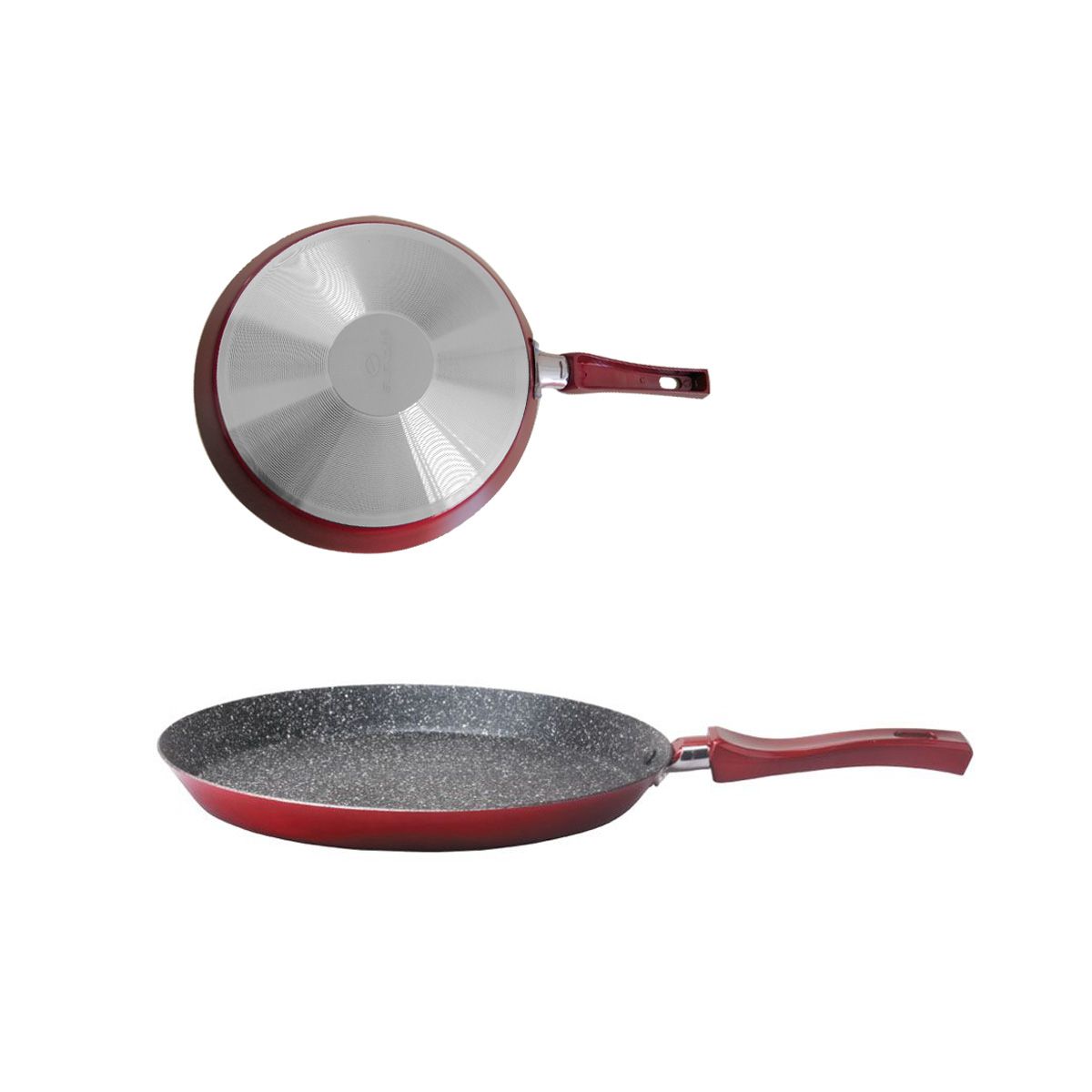 Tиган за палачинки • Висококачествен алуминий • Устойчиво и незалепващо мраморно покритие • Диаметър: 26 см • Височина: 2 см • Дебелина на стените: 1,8 мм • Равномерно разпределение на топлината по цялото дъно • Не съдържа PTFE, PFOA и тежки метали • Червен металик