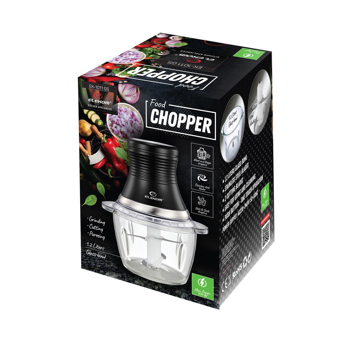 Чопър EK-1011GS, 300W, 2 режещи остриета от неръждаема стомана, Стъклена купа 1.2 Литра